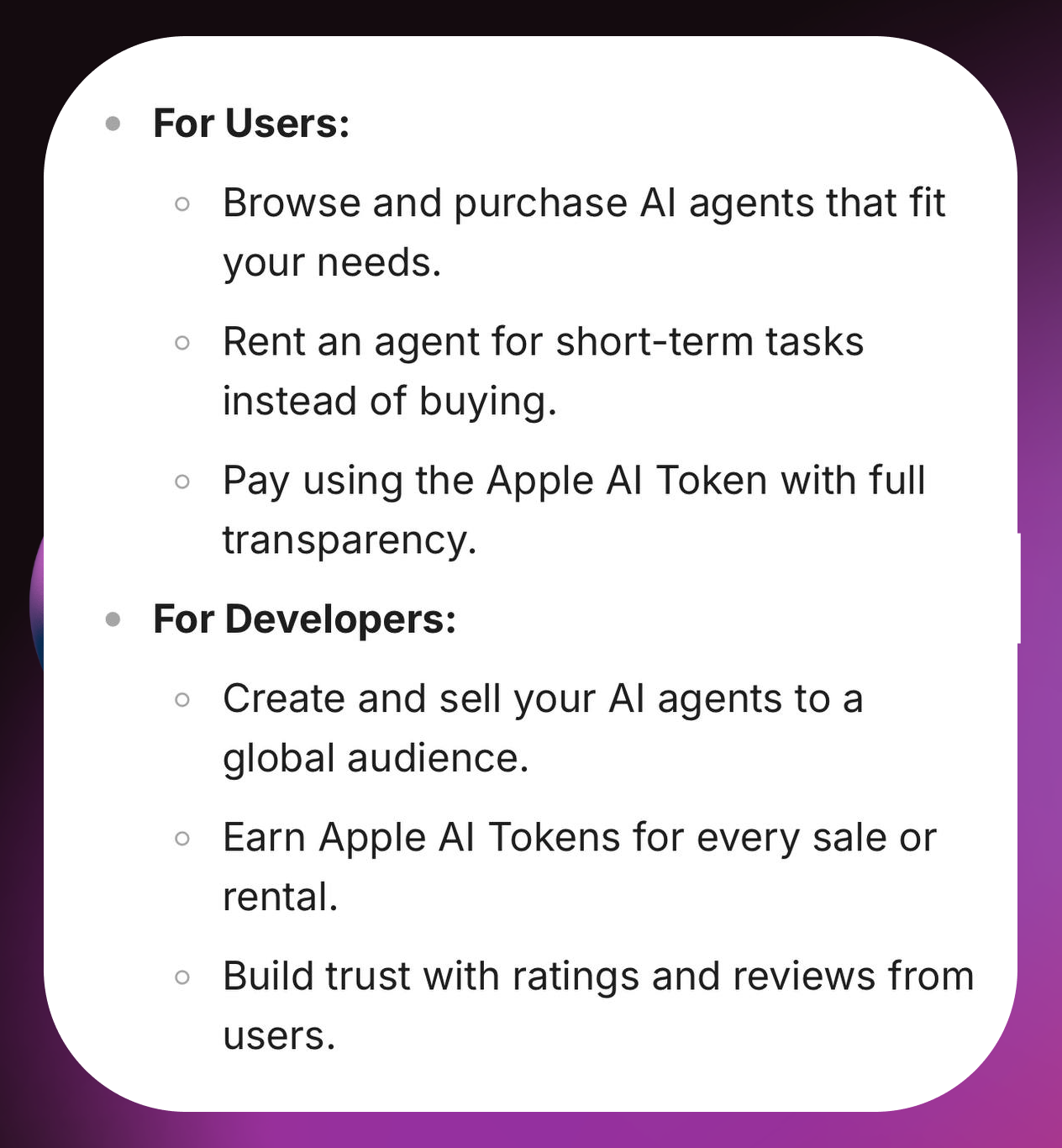 Apple AI envisions a world where artificial intelligence is accessible, personalized, and decentralized. Our goal is to democratize AI technology, allowing individuals and businesses to harness its power without technical barriers or centralized control. By blending AI with blockchain, we aim to foster trust, transparency, and inclusivity in the AI-driven future.
